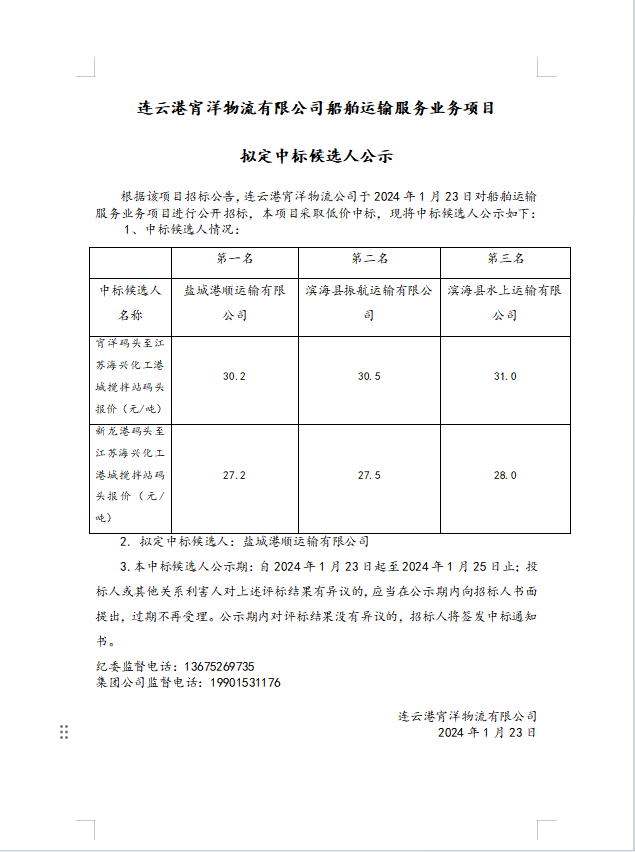 連云港宵洋物流有限公司船舶運輸服務業(yè)務項目擬定中標候選人公示