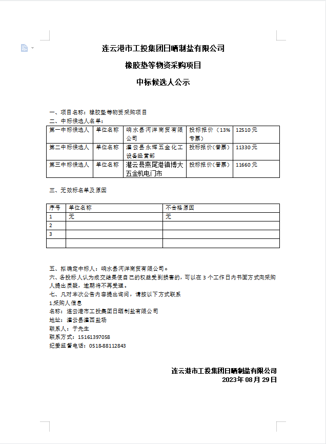 連云港市工投集團(tuán)日曬制鹽有限公司橡膠墊等物資采購項目中標(biāo)候選人公示