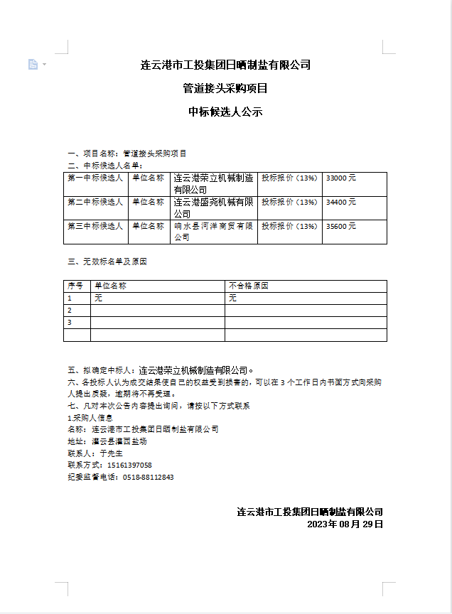 連云港市工投集團日曬制鹽有限公司 管道接頭采購項目中標(biāo)候選人公示