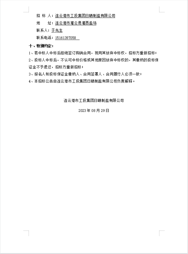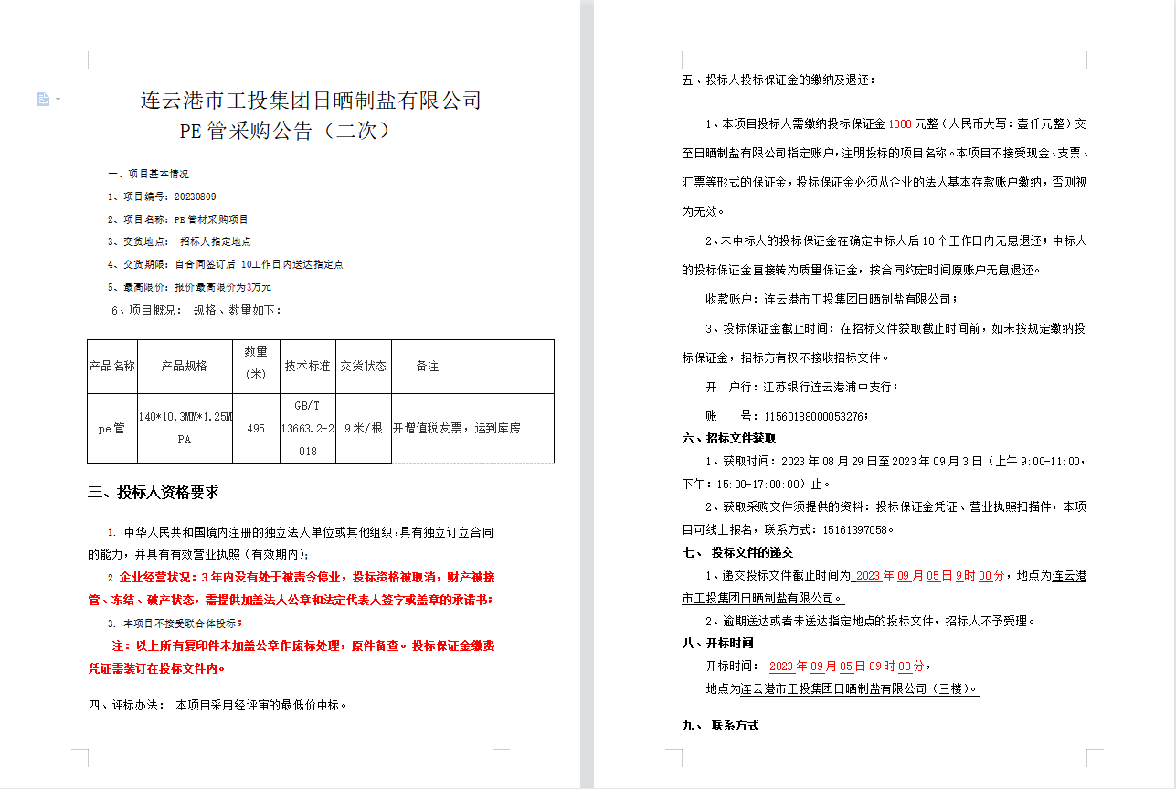 連云港市工投集團日曬制鹽有限公司PE管采購公告(二次)