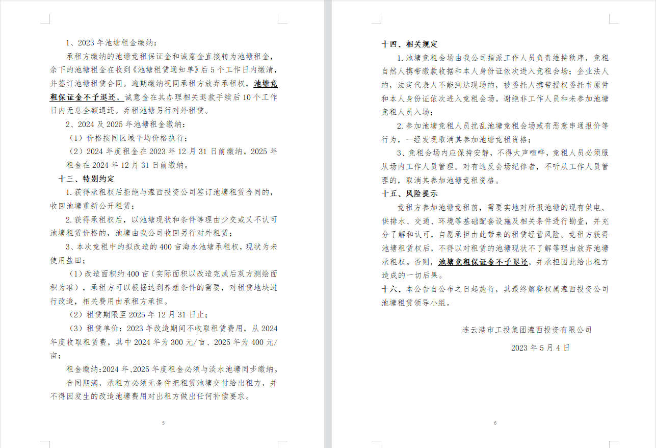 連云港市工投集團灌西投資公司2023年度淡水養(yǎng)殖池塘公開競租公告