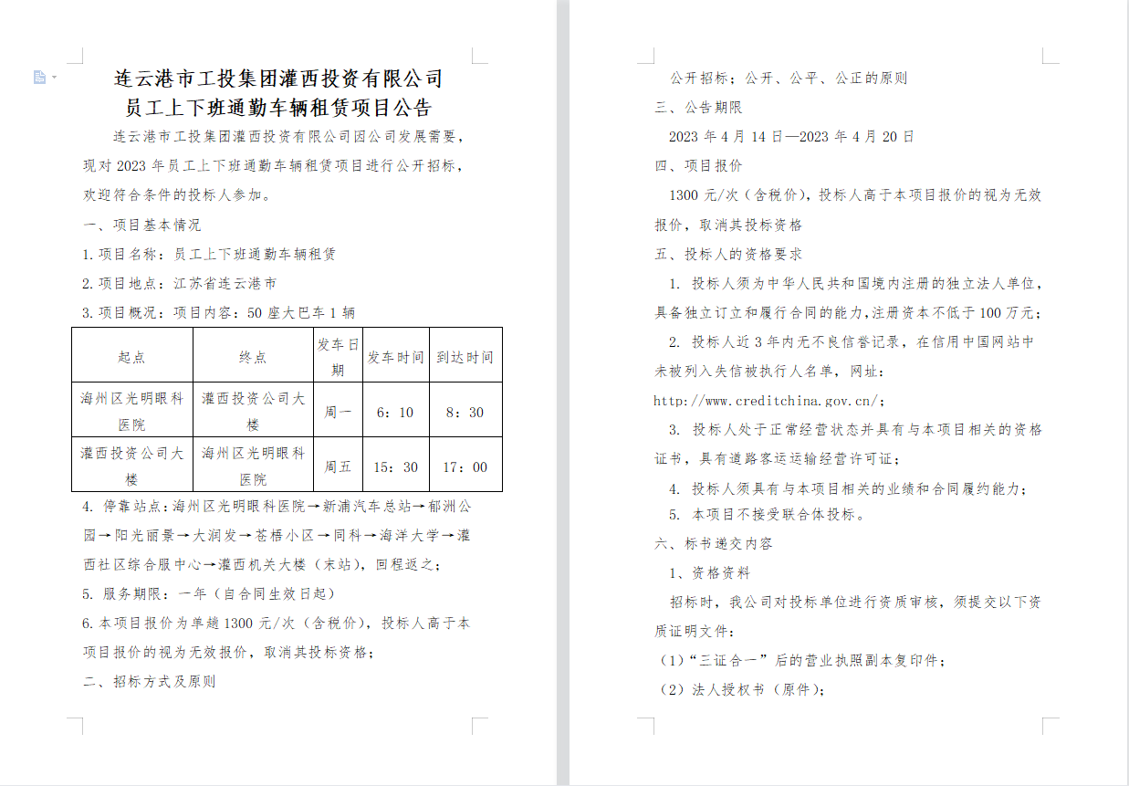 連云港市工投集團(tuán)灌西投資有限公司 員工上下班通勤車(chē)輛租賃項(xiàng)目公告