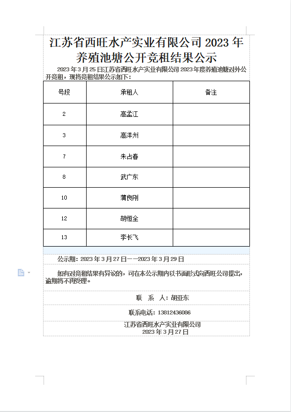 江蘇省西旺水產(chǎn)實業(yè)有限公司2023年養(yǎng)殖池塘公開競租結(jié)果公示