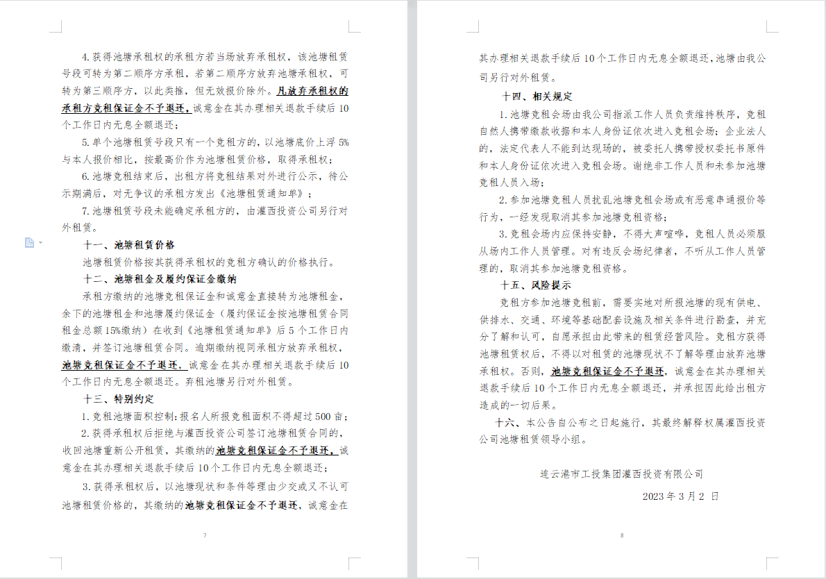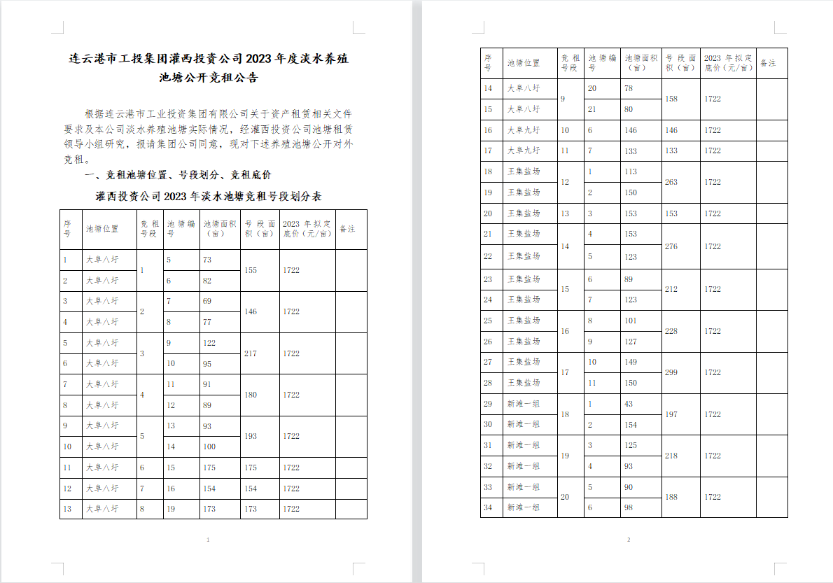 連云港市工投集團灌西投資公司2023年度淡水養(yǎng)殖池塘公開競租公告