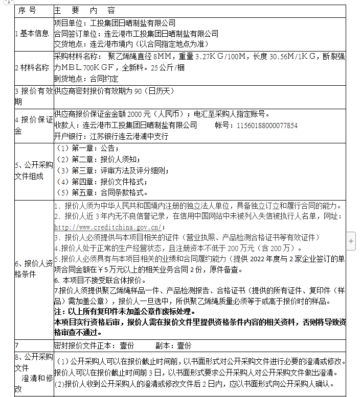 聚乙烯繩公開采購公告