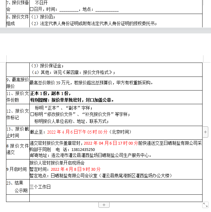 密封報(bào)價(jià)開(kāi)啟時(shí)間及地點(diǎn):2022年04月8日前,如有特殊情況時(shí)間另行通知。