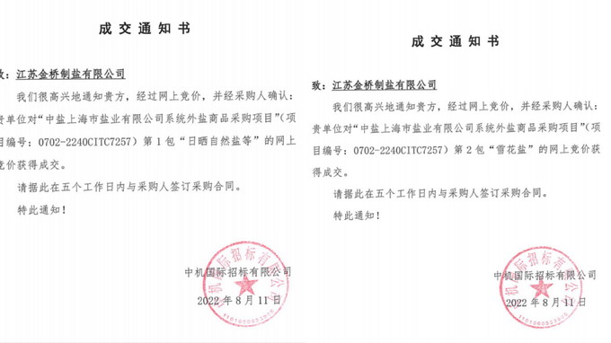 近日,我公司以網(wǎng)上競價(jià)的方式,成功中標(biāo)中鹽上海市鹽業(yè)有限公司系統(tǒng)外鹽商品2022-2023年度采購項(xiàng)目,標(biāo)的量1.5萬余噸。