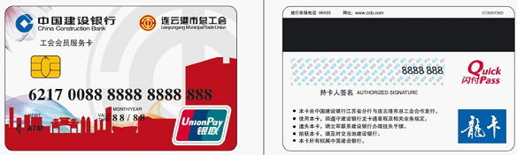 | 工會(huì)會(huì)員服務(wù)卡是一張集工會(huì)會(huì)員身份識(shí)別功能、會(huì)員服務(wù)功能于一體的工會(huì)會(huì)員實(shí)名服務(wù)卡。具體功能如下: (一)身份識(shí)別功能。工會(huì)會(huì)員服務(wù)卡具有工會(huì)會(huì)員身份識(shí)別功能,記載工會(huì)會(huì)員基本信息,全市工會(huì)會(huì)員實(shí)名制動(dòng)態(tài)管理。 (二)工會(huì)服務(wù)功能。工會(huì)會(huì)員服務(wù)卡具有劃入存貯工會(huì)所有幫扶救助資金的服務(wù)功能,持卡會(huì)員還可免費(fèi)或優(yōu)惠享受工會(huì)組織提供的困難幫扶、職業(yè)介紹、技能培訓(xùn)、心理咨詢、勞動(dòng)爭(zhēng)議調(diào)解等服務(wù)。 (三)金融服務(wù)功能。工會(huì)會(huì)員服務(wù)卡具有銀行借記卡的所有功能。 (四)社會(huì)服務(wù)功能。工會(huì)會(huì)員服務(wù)卡整合部分社會(huì)服務(wù)功能,通過(guò)工會(huì)與加盟機(jī)構(gòu)合作,為持卡會(huì)員提供醫(yī)療保健、文化娛樂(lè)、商業(yè)購(gòu)物、生活服務(wù)等領(lǐng)域的優(yōu)惠服務(wù)。(具體簽約單位見(jiàn)市總工會(huì)網(wǎng)站http://www.lygzgh.org/ka/) 下圖為工會(huì)會(huì)員服務(wù)卡卡樣,連云港市總工會(huì)發(fā)行的工會(huì)會(huì)員服務(wù)卡只此一種設(shè)計(jì),請(qǐng)認(rèn)準(zhǔn)連云港市總工會(huì)logo和工會(huì)會(huì)員服務(wù)卡字樣,若同此圖不同均非工會(huì)會(huì)員服務(wù)卡。