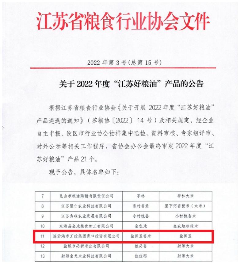 日前,江蘇省糧食行業(yè)協(xié)會發(fā)布2022年度“江蘇好糧油”產(chǎn)品名單,由我公司生產(chǎn)的鹽田玉香米成功入選。