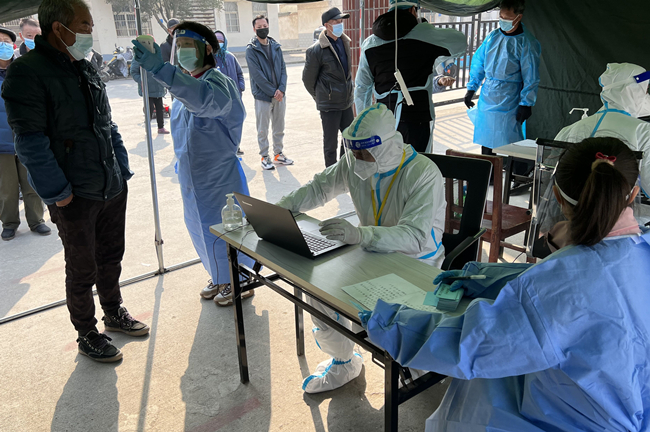 圖為黨員霍晶協(xié)助醫(yī)務人員對居民進行核酸采樣