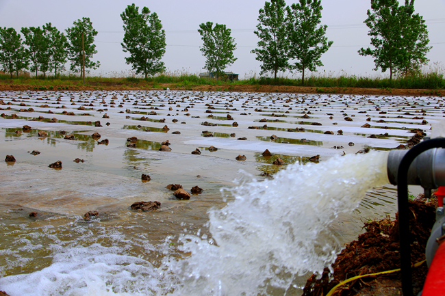 ▲塑盤育秧后進入秧苗管理期,條田管理工正引水灌溉,全力做好保苗護苗工作,為下一步序時推進插秧工作打下基礎。