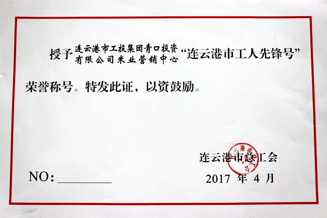 近日,公司米業(yè)營(yíng)銷中心在連云港市總工會(huì)組織的 “2017年度連云港市工人先鋒號(hào)”評(píng)選活動(dòng)中,被授予“工人先鋒號(hào)”榮譽(yù)稱號(hào)。
