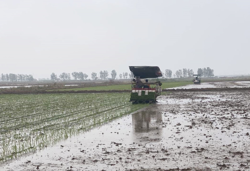 6月4日,大新農(nóng)場搶抓農(nóng)時,全面開始水稻插秧工作,插秧機來回穿梭作業(yè),田間地頭一派忙碌景象。當(dāng)天,組織插秧機13臺,秧苗轉(zhuǎn)運車6臺次,一天可以完成插秧作業(yè)550余畝。(王 璐)