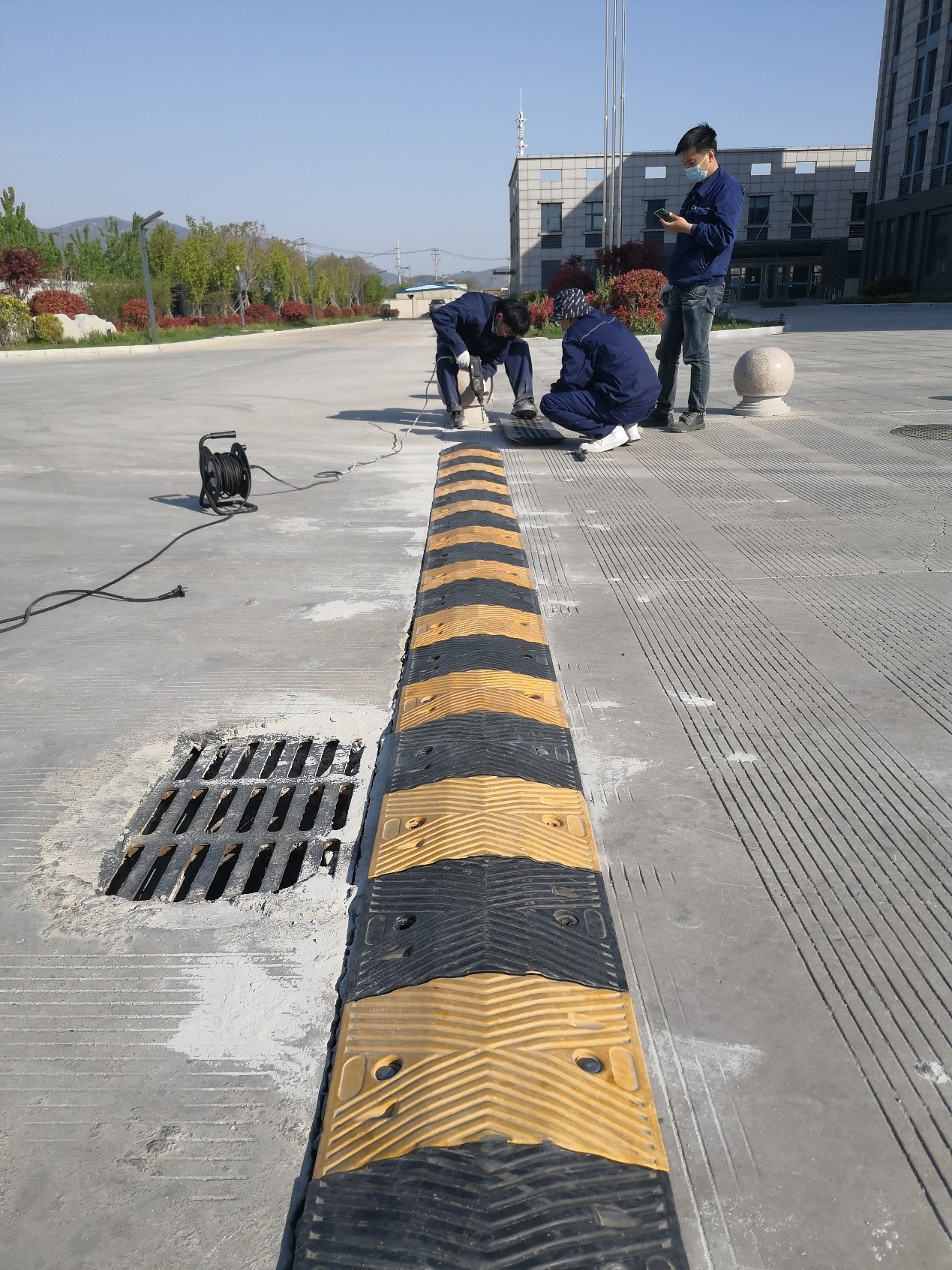 為了強(qiáng)化道路交通安全,公司在廠區(qū)主大門入口和停車場兩處加設(shè)減速帶。圖為安全管理部員工在現(xiàn)場施工。