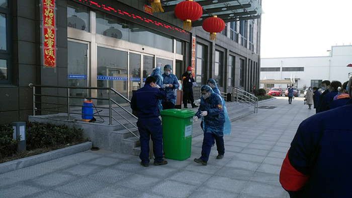發(fā)熱員工被救護(hù)車(chē)運(yùn)送出廠區(qū)后,乙班班長(zhǎng)封安帶領(lǐng)員工對(duì)隔離間進(jìn)行消殺。消殺、救護(hù)工作全部完成后,員工將防護(hù)服、口罩等防護(hù)用品全部按規(guī)定丟入廢棄物垃圾桶,作密封保存待處理。