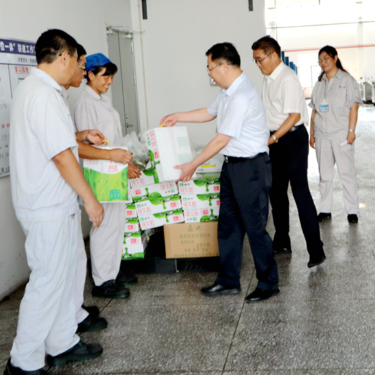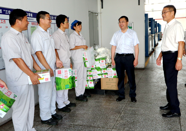 8月1日上午,集團(tuán)公司黨委副書記戴鴻鳴、工會主席劉承志來我公司慰問生產(chǎn)一線員工,為辛勤工作的員工送來牛奶、綠豆等防暑降溫慰問品。公司黨支部書記、副董事長鄒德兵,總經(jīng)理韓立新等多位領(lǐng)導(dǎo)陪同。