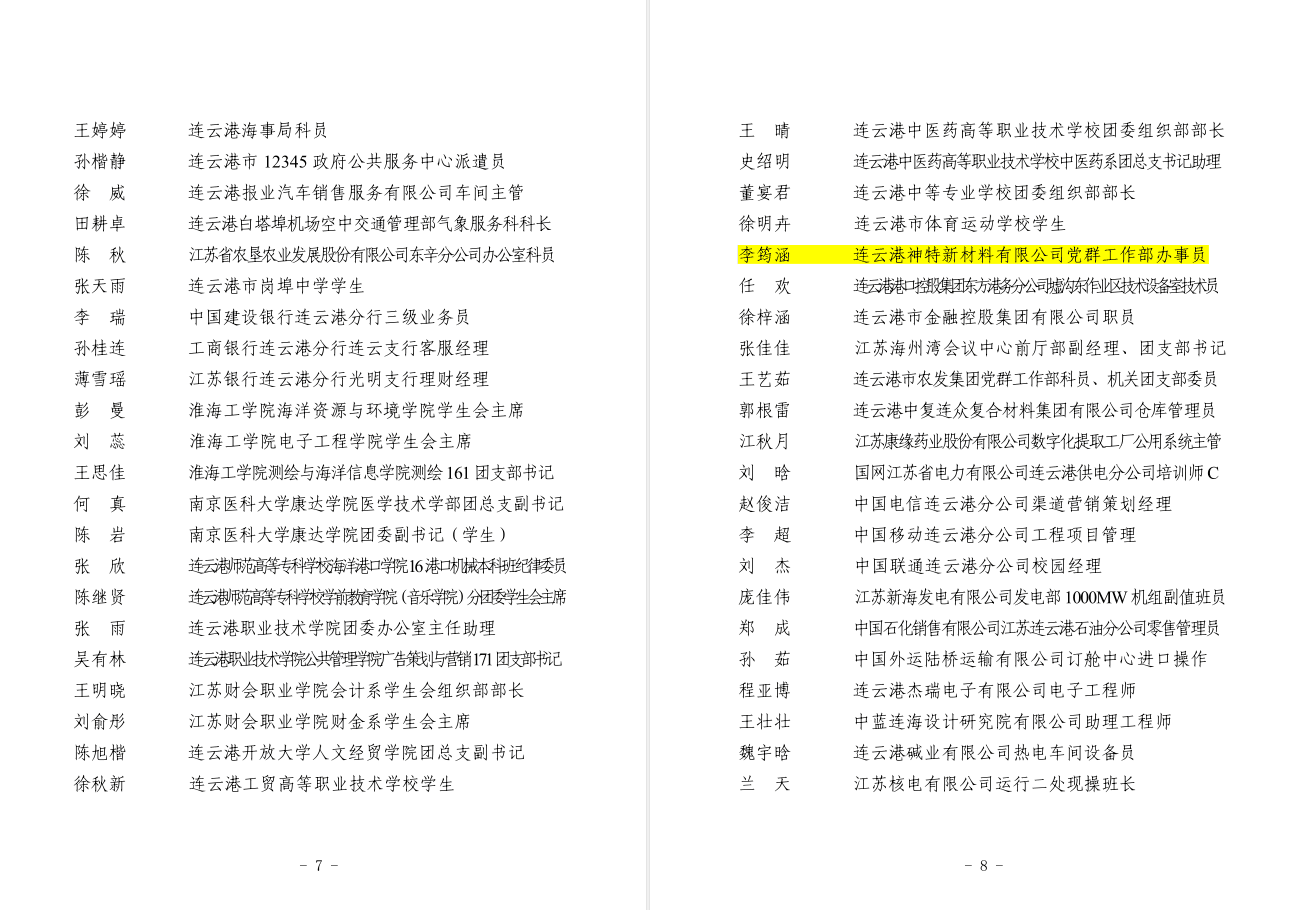 近日,共青團(tuán)連云港市委員會公布了2018年度“連云港市優(yōu)秀共青團(tuán)員”“連云港市優(yōu)秀團(tuán)干部”“連云港市五四紅旗團(tuán)委”“連云港市五四紅旗團(tuán)支部”(總支)名單,我公司員工李筠涵榜上有名,被授予“連云港市優(yōu)秀共青團(tuán)員”稱號。