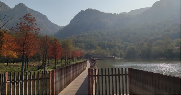 斗轉星移,山河已變,五百年前詩人所描述的風景我們無法再欣賞到,但是現在的園林水庫更有一番風采?;鸺t的水杉是她最引人注目的特色之一,寒風掠過,水杉的葉子也逐漸變成了鮮艷的火紅色,猶如一片片燃燒的火焰,在寒冷的季節(jié)中增添了一抹暖色。徜徉于火紅的水杉林,陽光下樹影婆娑,寧靜,安逸,沉醉于詩畫中。波光粼粼的湖水更是一幅美妙的畫卷,清澈透明,水草搖曳,微波蕩漾,游魚穿梭,仿佛寒冷與它們無關。棧橋嫻熟地穿越著園林與水庫,一直連接到山腳,行走其上,腳下水光瀲滟,眼前層林盡染,晴空之下無一絲塵埃,啾啾鳥鳴,沙沙葉響,嘩嘩水流,大自然的樂章歡快靜謐。