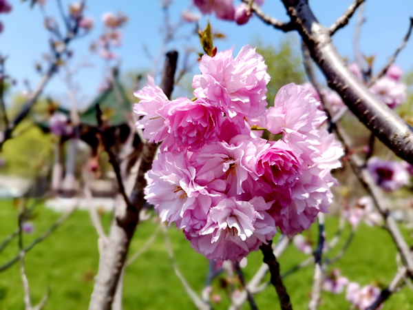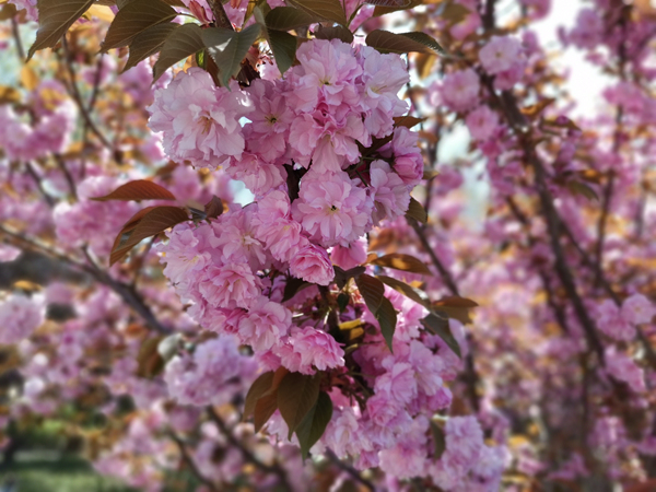 隨著梅花、迎春花、玉蘭花、杏花桃花的陸續(xù)謝幕,海棠花們開始華麗登場。有著藍天白云的映襯,明媚陽光照耀下的海棠花千嬌百媚,一團團,一簇簇,你挨著我,我擁著你,粉粉嫩嫩,不正像走出病毒霧霾,露出久違笑容的人們的笑臉嗎?