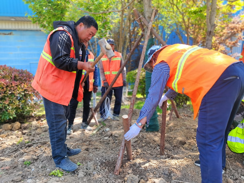 在中科院,只見工程車輛來來往往、橙色身影忙忙碌碌……到處都是一派繁忙、紅紅火火的景象。闖將孫玉虎,虎將金華穿梭在工程現場,親自指揮調度綠化工程收尾工作。大家分工有序:定點劃線、搬運苗木、栽植澆水、垃圾清理……有條不紊。中午時分,熾熱的陽光照在臉上也是火辣辣的,忙碌了一上午的工人大汗淋漓,擰開瓶蓋,咕嚕咕嚕喝了幾大口涼水,用袖子蹭了下額頭的汗,又干勁十足地投入到工作中。
