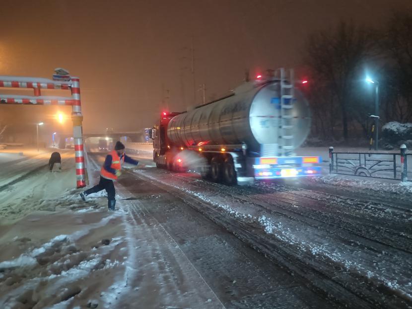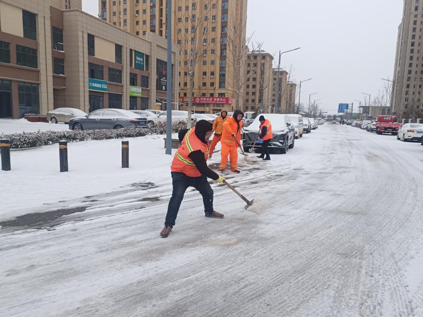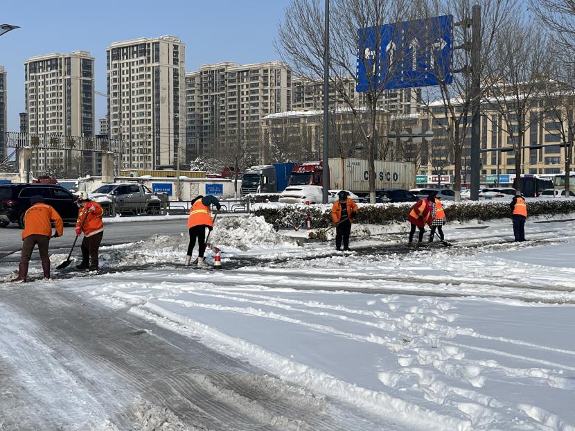 5日凌晨4點(diǎn),該公司負(fù)責(zé)人于廣華已經(jīng)在除雪的第一線,積極安排工作調(diào)度,對新光路、平山路、黃海大道等重要路段突擊清掃,大家頂著風(fēng)雪,齊心協(xié)力,分工明確,高效配合,全力清除路面上的積雪和暗冰,及時(shí)為車輛和行人清理出一條條“安全路”。