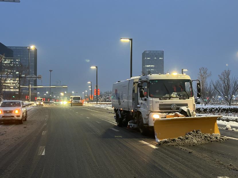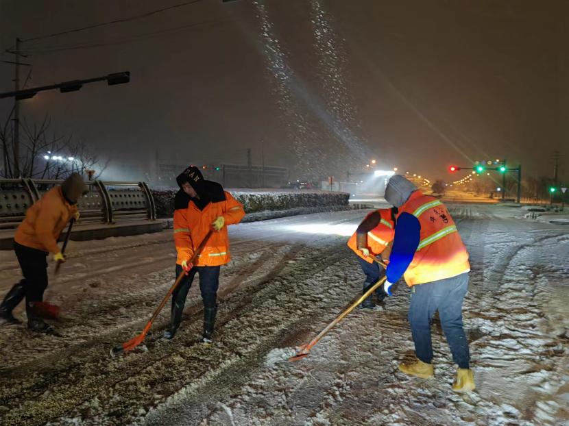 上午10時許,暴雪如約而至。裝有融雪劑的車輛全部整裝待發(fā),聞令而動,采取“人工+機(jī)械”不間斷作業(yè)模式,對轄區(qū)主次干道、橋涵、火車站東站、創(chuàng)智大廈等帶坡路段及時拋撒融雪劑,采取“滾刷+鏟車”組合方式,反復(fù)排掃路面積雪,確保主次干道、帶坡路段通暢無冰。