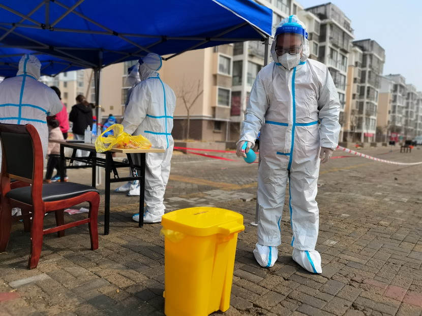 清晨6點(diǎn)30分,1號(hào)檢測(cè)點(diǎn),李明同志在檢查物資,“大白”服裝4套、“小藍(lán)”服裝6套、棉簽600根……;2號(hào)檢測(cè)點(diǎn),于洪亮在將物資上桌,病毒核酸檢測(cè)試管、棉簽、消毒液,“還缺少一瓶酒精,我立即反饋給社區(qū),請(qǐng)社區(qū)抓緊安排送來”;4號(hào)檢測(cè)點(diǎn),蘇玲、秦黎明正在互相幫忙穿好防護(hù)服,“秦姐,這個(gè)防護(hù)面罩里外有兩層薄膜,我給你撕掉,這樣就不會(huì)有霧氣了”,“嗯嗯,你這個(gè)拉鏈得拉到頂,我們自己也一定要做好防護(hù)”秦黎明溫柔的說;5號(hào)檢測(cè)點(diǎn),內(nèi)退黨員孫芳和姜海洋,互相在防護(hù)服后背寫上對(duì)方的名字,以便于更高效的完成檢測(cè)工作;6號(hào)檢測(cè)點(diǎn),霍正鋼、朱文健、韓永剛、邱榮濱正在清點(diǎn)檢測(cè)小卡片;7號(hào)檢測(cè)點(diǎn),張強(qiáng)在拿著酒精給廢物處置垃圾箱消毒;8號(hào)檢測(cè)點(diǎn),新加入的孫銀、占恒春、尹永明、韓永光、趙紹慶正在給消殺噴霧劑灌裝84消毒液,社區(qū)8個(gè)檢測(cè)點(diǎn)的消殺工作全部由昌圩臨時(shí)黨支部志愿者負(fù)責(zé)。