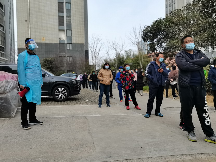 李明:“請(qǐng)大家站好,保持一米線的距離,很快就排到了,不要急躁。”