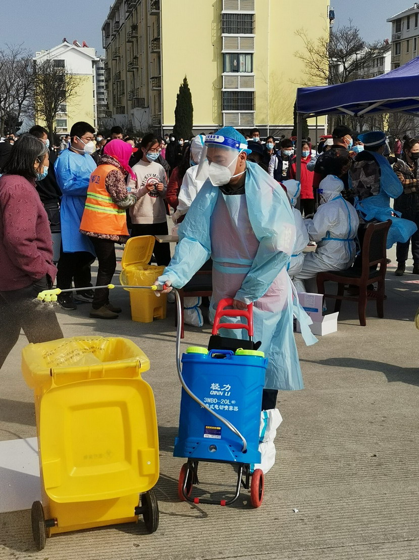 ▲昌圩社區(qū)臨時黨支部組織委員霍正鋼今天擔(dān)當(dāng)環(huán)境消殺員