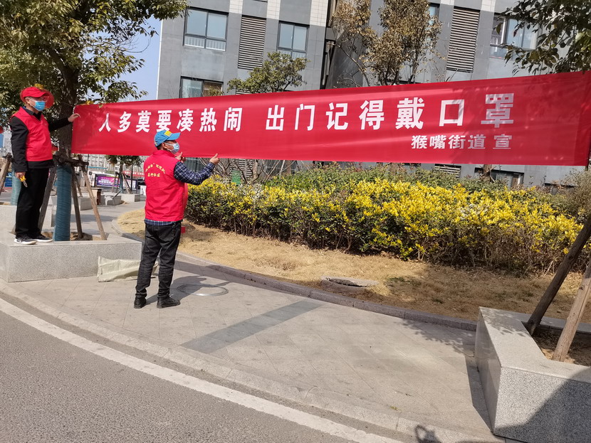 ▲昌圩社區(qū)臨時黨支部書記李明,黨員骨干于洪亮懸掛疫情宣傳標(biāo)語。