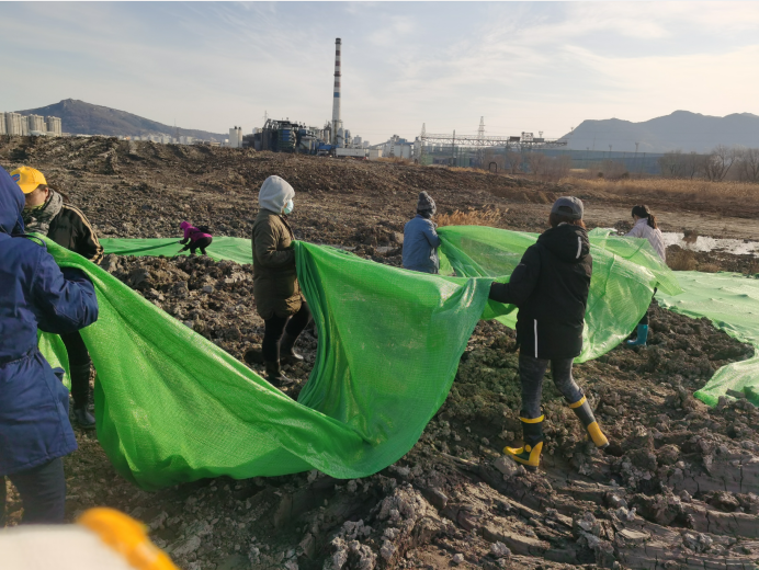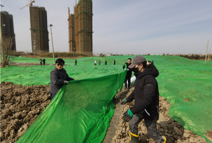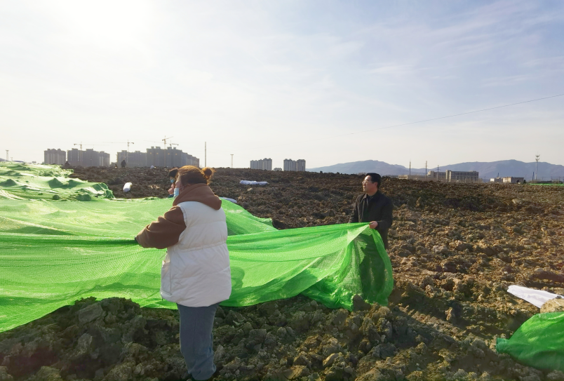 寒冷絲毫沒有降低大家的熱情,路面因為每天噴灑防塵導(dǎo)致潮濕泥濘,大家穿上雨靴,爬上爬下,一鼓作氣,經(jīng)過兩天齊心協(xié)力的辛勤勞作,防塵網(wǎng)終于覆蓋完畢。遠(yuǎn)遠(yuǎn)望去,覆蓋綠網(wǎng)后的區(qū)域如同覆蓋了一片綠色植被。此次綠網(wǎng)覆蓋行動,不僅抑制了二次揚塵污染環(huán)境,保護(hù)了生態(tài)環(huán)境,同時達(dá)到了環(huán)境美化的效果。