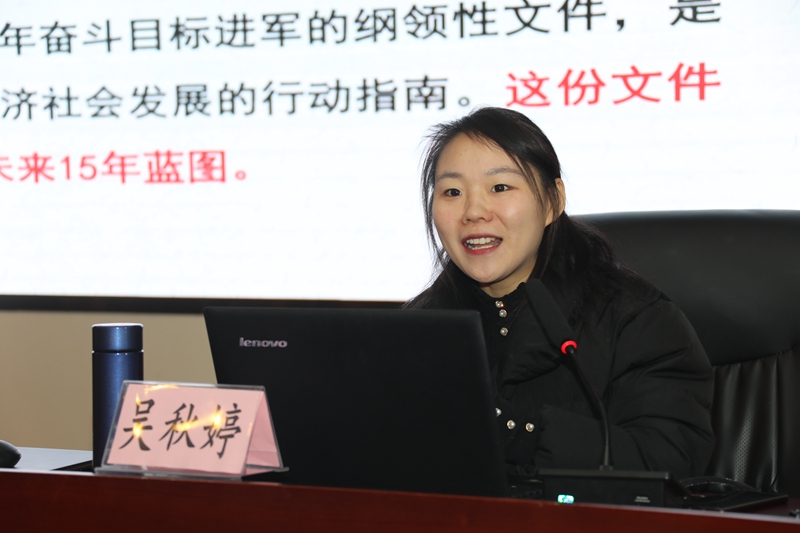 吳秋婷副主任在題為“開啟全面建設(shè)社會主義現(xiàn)代化國家新征程”報告中,從新階段與新目標(biāo)、新理念與新部署、新變化與新格局等三個方面給大家解讀了黨的十九屆五中全會精神?!靶码A段與新目標(biāo)”部分,介紹了我國在決勝全面建成小康社會取得的三大決定性成就,即十三五期間,全面深化改革取得重大突破;經(jīng)濟(jì)實(shí)力、科技實(shí)力、綜合國力躍上新的大臺階。在“新理念與新部署”部分,從社會發(fā)展、創(chuàng)新發(fā)展、統(tǒng)籌發(fā)展等角度分別提出了習(xí)近平總書記在新時代下對中國共產(chǎn)黨人的要求以及我國社會發(fā)展必須遵循的基本原則。在“新變化與新格局“部分,強(qiáng)調(diào)實(shí)現(xiàn)“十四五”規(guī)劃和2035年遠(yuǎn)景目標(biāo)意義重大、任務(wù)艱巨,但是前景光明,全黨全國各族人民要緊密團(tuán)結(jié)在以習(xí)近平同志為核心的黨中央周圍,同心同德,頑強(qiáng)奮斗,積極響應(yīng)十九屆五中全會對全黨全國人民的號召,奪取全面建設(shè)社會主義現(xiàn)代化國家的勝利。