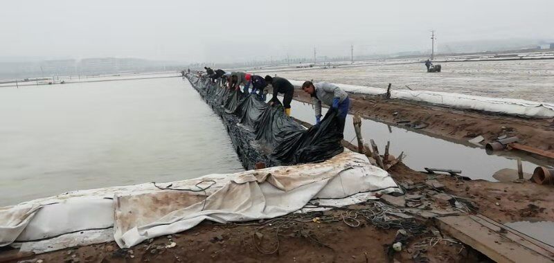 由于勞動(dòng)力較為缺乏,人工扒鹽分為兩個(gè)班次白班和小夜班。工人們?cè)谕瓿筛髯园啻稳蝿?wù)的同時(shí),還要承擔(dān)起后期繁瑣的相關(guān)工作。例如:扒鹽前要將塑池內(nèi)的塑布整理、收縮到位、用活碴機(jī)對(duì)準(zhǔn)備要扒格塊進(jìn)行活碴、成廩后對(duì)鹽廩全面覆蓋、并抽出專人對(duì)大夜班空檔期電纜線及機(jī)電設(shè)備進(jìn)行看管等等。其中池板整理是一項(xiàng)緊急活,扒完鹽后鹵水要緊跟著進(jìn)池,小夜班的人下班后有時(shí)只睡幾個(gè)小時(shí),早上7點(diǎn)多就來(lái)到灘頭整理池板,為抓緊灌池爭(zhēng)分奪秒爭(zhēng)。