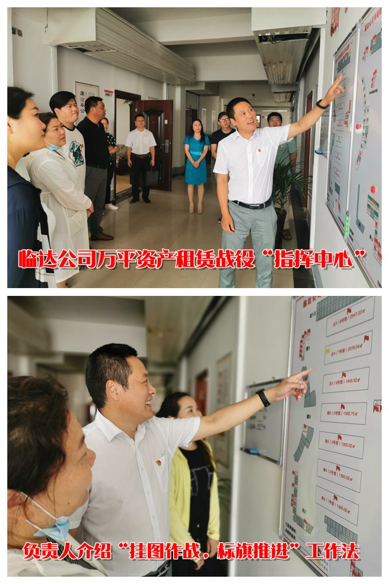 “分解任務(wù),每天出租180平方,我們用掛圖作戰(zhàn)工作方法,在困難中找優(yōu)勢(shì),在優(yōu)勢(shì)中找方法,將集中資產(chǎn)劃分片區(qū),分而治之,實(shí)行一個(gè)片區(qū)一個(gè)目標(biāo)導(dǎo)向,一個(gè)片區(qū)一個(gè)工作方法”“臨鋒而行,達(dá)道致遠(yuǎn),這是臨達(dá)公司的立企宗旨,我們是這么喊,也是這么干的”“臨達(dá)的年輕同志們是我們能夠突破7200平方任務(wù)的秘密武器,他們上門商談至天黑,周六周日讓他們休息都不休息,依然堅(jiān)守崗位跑市場(chǎng)”在臨達(dá)公司的“作戰(zhàn)指揮中心”,聽取負(fù)責(zé)人杜洪波的介紹后,參加采風(fēng)的同志都忍不住豎起大拇指為先拔頭籌,超額超時(shí)完成任務(wù)的臨達(dá)全體“指戰(zhàn)員”點(diǎn)了個(gè)贊。