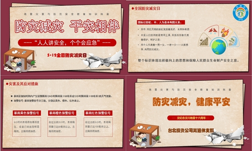 近日,離退休支部開展“5·12防災(zāi)減災(zāi)”科普活動(dòng)。結(jié)合支部的實(shí)際情況,通過辦公場所用電防火安全檢查和交通出行安全警示,進(jìn)一步排查整改生活、工作中存在的安全隱患。組織觀看防災(zāi)減災(zāi)宣傳片和制作防災(zāi)減災(zāi)PPT來普及防災(zāi)減災(zāi)知識(shí),了解地震、臺(tái)風(fēng)、暴雨、洪水等自然災(zāi)害的應(yīng)對(duì)措施,來防范化解災(zāi)害風(fēng)險(xiǎn),提升公眾防災(zāi)減災(zāi)的意識(shí)和能力,實(shí)現(xiàn)“人人講安全,個(gè)個(gè)會(huì)應(yīng)急”。