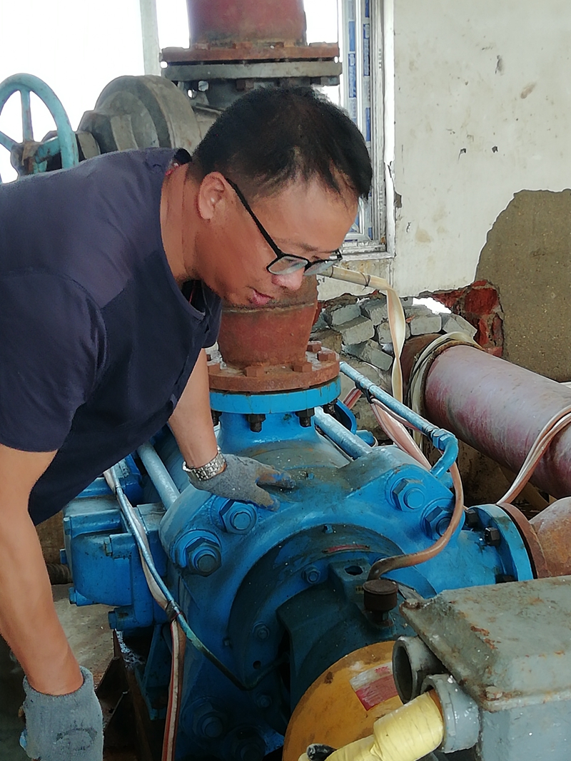 在徐圩運鹽河畔,玻璃鋼管道維修現(xiàn)場,發(fā)電機隆隆轟鳴聲中不時夾雜著角磨機刺耳的打磨音,所到之處風塵飄揚。白色塵霧中,一名五十多歲的中年漢子正凝神專注的低頭操作,仔細的打磨著玻璃鋼管道接頭的每一片角落,絲毫不敢馬虎。不時,他摘下眼鏡取下戴在嘴上的防護口罩,鼓起腮幫用力吹去眼鏡上飄落的粉塵。顧不得擦一把額頭上的汗水,戴好眼鏡和口罩,調(diào)整好位置繼續(xù)俯下身打磨,他就是翔立分公司顧圩泵站班組長顧昌全。