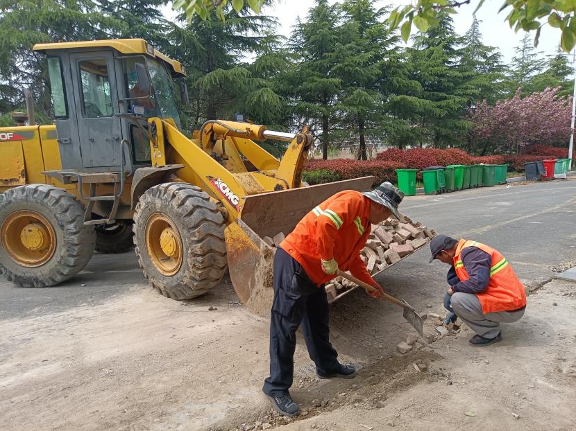 項目開工前,盛達市政分公司召開中科院提升改造專項會議,根據(jù)各單項工程落實安全生產責任制,分班組劃片區(qū),并對隱蔽工程、交叉作業(yè)項目制定專項施工方案。該項目工期僅 30 天,由于工期緊,任務重,施工人員正在開足馬力搶時間、趕進度,在項目施工現(xiàn)場,原道磚清除、舊電纜拆除、新建道路基礎墊層、路牙石鋪設等各施工任務同步開展,挖掘機、裝載機、貨車等各種工程車輛有序穿梭,各施工現(xiàn)場圍擋、指示牌、路錐等擺放規(guī)范,人員工作服、安全帽等穿戴整齊,確保安全文明施工。