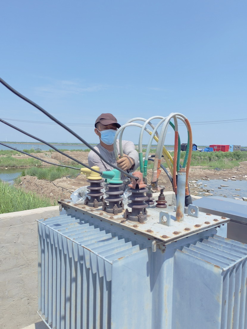 10時40分搶修工作全面展開,當(dāng)天地下氣溫接近38度,塔臺上氣溫接近50度,變壓器上燙的要命,人在上面只是感覺熱浪滾滾,電工尹永明身上衣服很快被汗水濕透,太陽暴曬,如火的驕陽絲毫沒有阻擋施工進度,一切工作都進行的繁忙有序,井井有條。中午12時30分經(jīng)過近2個小時的搶修,工作人員完成了變壓器的維修任務(wù),保證了魚塘用電設(shè)備的正常運轉(zhuǎn)。
