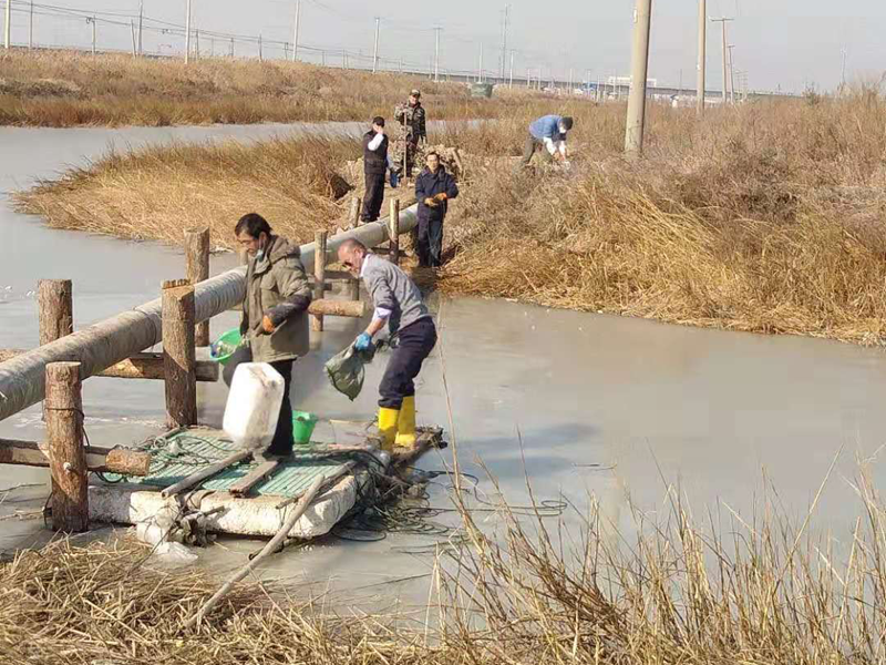 方案是拿出來了,但苛刻的現(xiàn)場環(huán)境、嚴(yán)峻的施工條件像冬季的陰霾再度籠罩在大家心頭!河對岸無交通橋梁人員無法直達對面,利用船只過河又面臨著河面結(jié)冰。以往這種距離的過河都是采用PE管(質(zhì)地柔軟彎曲性能優(yōu)越),但購買PE管道的成本太高。玻璃鋼管道本來就比較脆弱易碎,更何況是三節(jié)連接在一起長達36米的過河管道,這在鹽場管道施工史上還沒有先例。