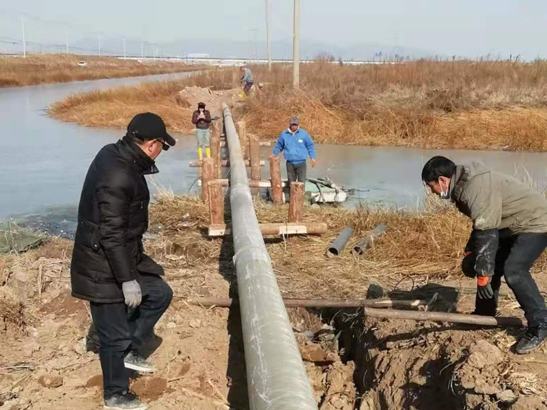 難!難!難!有困難才具有挑戰(zhàn),在“四拼”前一切困難皆為“紙老虎”,大家及時將壓力變?yōu)閯恿?。確定方案后,立即分頭行動,一切工作按部就班,購買8米木樁,河岸邊專人指揮長臂挖掘機機械打樁,頭頂高壓線與通信線路相互交織,現(xiàn)場安全員全過程監(jiān)督指揮保障施工安全距離緊張施工,利用簡易泡沫筏人工敲開河面冰層,劃到河心鉆孔安裝木橫擔(dān),人工開挖河對岸管道,切割吊取管道,打磨涂覆,一切都在有條不紊的進行中。考慮到玻璃鋼管道的易碎性,不敢使用挖掘機吊裝,只能全人工小心翼翼的一小段一小段的輕抬慢放,慢慢挪到門型橫擔(dān)上緩緩過河,捆綁固定,最后是對口纏裹涂覆回填竣工。