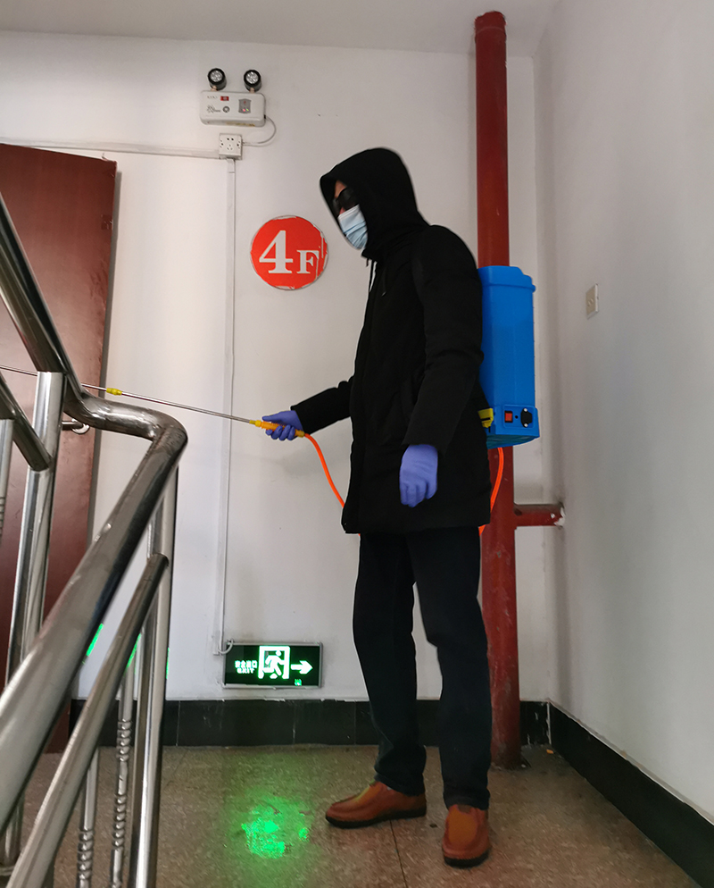 義務消毒,沒有報酬,得隨時待命,看起來是應者寥寥的苦差。在昌圩湖職工小區(qū)和公司機關大樓,卻穿梭著這樣的身影。他們背著裝滿消毒液的噴壺,穿梭在社區(qū)街道和辦公場所,把消毒液噴灑到的每一處。