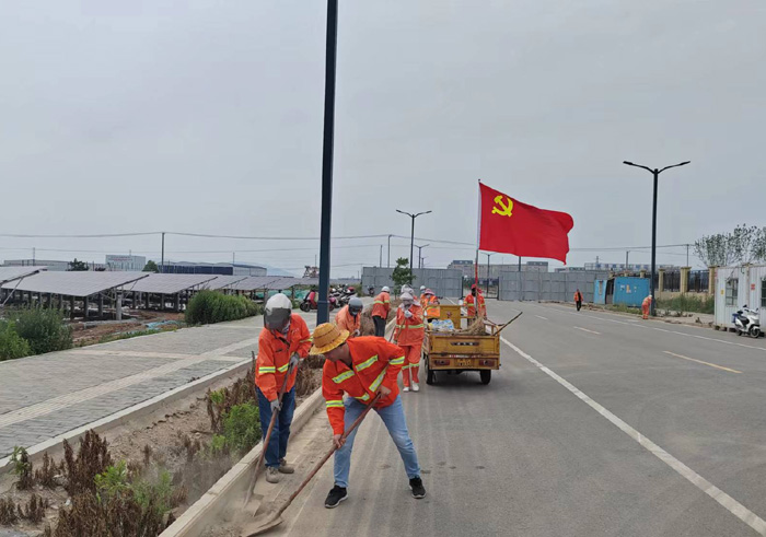 6月21日,該黨支部近30余名黨員在支部的感召下,匯集于新區(qū)節(jié)能一路道路兩邊。勞動現(xiàn)場,黨員生產(chǎn)骨干姚功身先士卒,無懼泥土粉塵揚起,揮汗清理,不怕臟、不怕累,不放過任何衛(wèi)生死角。勞模張學(xué)軍與老黨員徐習(xí)東相互配合,打包,裝車, 及時轉(zhuǎn)運各類垃圾達(dá)50多袋,清掃路面積土近1500米長,大家分工明確,重活臟活搶著干。隊員們齊心協(xié)力,用實際行動詮釋黨員吃苦在前、勇于擔(dān)當(dāng)?shù)姆瞰I(xiàn)精神。經(jīng)過四個多小時清理,主干道及周邊道路垃圾、雜草、泥土全部清理干凈,高質(zhì)量完成奉獻(xiàn)勞動,鮮艷的黨旗在陽光的照耀下顯得格外閃亮。(楊波)