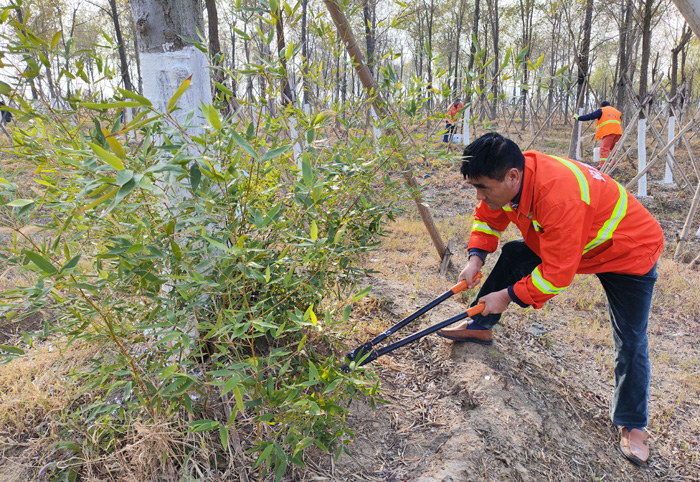 當前,為扎實做好冬季樹木養(yǎng)護工作,提高樹木的過冬、抗病和抗蟲能力,李傳武帶領(lǐng)班組全員開展樹木涂白行動,悉心為樹木披上“防寒衣”。為達到同一標準,他采用“立桿涂白法”,首先安排專人進行劃線,將行道樹涂白高度統(tǒng)一控制在1.2米,使區(qū)域內(nèi)涂白高度保持一致,確保樹木涂白效果與植物整體美觀,經(jīng)過10天的持續(xù)工作,完成10000余棵行道樹涂白工作(完成工作量約20%)。