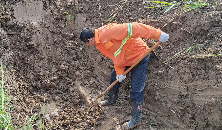 市政分公司組織搶修人員迅速到場,調(diào)集挖機(jī)與搶修材料,有序開展應(yīng)急搶修。維修人員首先對漏水管道實(shí)施開挖,經(jīng)過維修人員仔細(xì)挖開后確定直徑110PVC管道老化導(dǎo)致管道連接端裂開。查明原因后,制定了相應(yīng)可行的搶修方案。搶修過程中,大伙不畏困難、分工有序,相互協(xié)作,在滿是泥濘的坑中開展維修作業(yè)。機(jī)械開挖、人工配合清淤、更換損壞管道、增設(shè)哈夫節(jié)等一系列的步驟,一通操作下來,搶修人員人人汗流浹背。經(jīng)過3個(gè)多小時(shí)連續(xù)奮戰(zhàn),高效完成此次搶修任務(wù)。