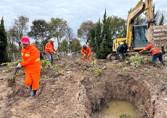 開設(shè)道口處的喬木,工人們先用高枝鋸和強力剪進行緊密精密修剪,保障后期植物根部能更好的吸收,由于挖掘機太大無法操作,只能全程人工操作,工人們干勁十足,4到5人一組,運送樹苗,挖坑、栽植、回填、覆土等步驟有條不紊地進行.并且對這些新移植的苗木和喬木進行灌水和設(shè)支撐固定架,經(jīng)過一天的持續(xù)奮戰(zhàn),累計移植50余顆大小樹木。(楊雨堃)