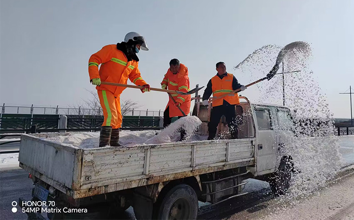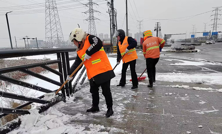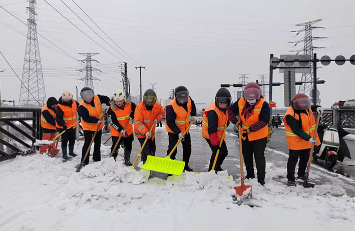 在白雪皚皚的雪地里,身穿橘黃工作服的保潔工人就是最美的點綴,他們頂著風雪吹打臉頰,兩人一組、三人一對,配合默契,揮動手中鐵銑,用力拋灑融雪鹽斤80多噸,10余車。道路橋粱兩側(cè),人行輔道邊上,公司上下齊心協(xié)力,9名班長在公司統(tǒng)一調(diào)配下,帶領班組人員,人工清除大小橋梁兩側(cè)積雪30多座,人行輔道長達3000多米長,站臺、叉路口積雪100多處,為保障恢復雪后新城環(huán)境整潔而努力工作。大型清掃設備駕駛員全員齊上陣,安全行車裝運融雪鹽斤里程達200多公里,工作時長10個多小時,安全操作鋤雪機械清理張圩互通引橋,埒子口大橋等路段長達5000多米長,有力彰顯機械破冰、除雪強大功能。(楊波)