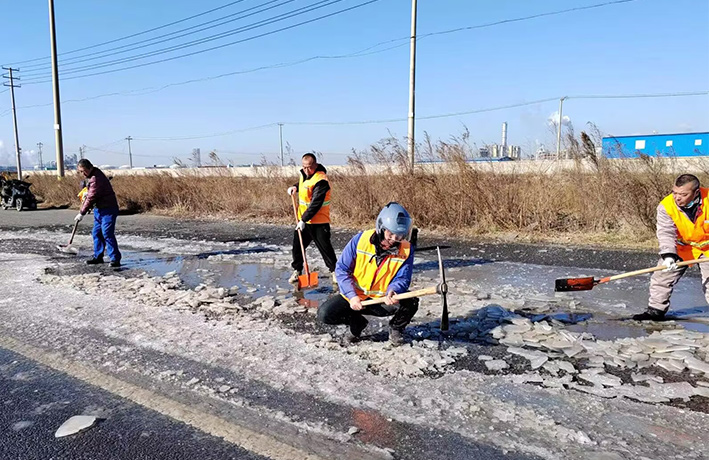 近期由于受冷空氣影響,氣溫低下,園區(qū)道路低洼積水處產(chǎn)生大面積結(jié)冰現(xiàn)象,如不及時清除,嚴(yán)重造成車輛側(cè)翻事故發(fā)生。道路排查現(xiàn)場,管理人員及時與園區(qū)二班對接,聯(lián)合開展“破冰保暢通”突擊活動。大家各負其責(zé),齊心協(xié)力,揮動手中鐵銑、羊鎬,經(jīng)過近4個多小時共同奮戰(zhàn),撬動冰塊近400多塊,清理積水300多平方、20多處。