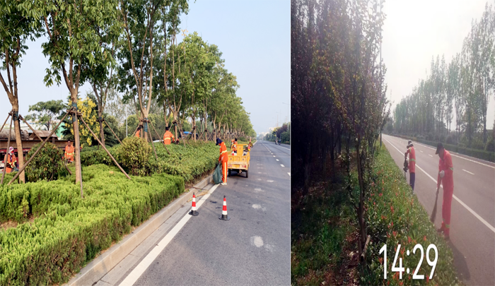 為提高工作效率,該分公司綠化班組在云港路、祥和路核心區(qū)域,采取人機結(jié)合方式,兵分4路同步推進“秋剪”作業(yè)。既:1路,班長帶領(lǐng)工人負責(zé)對道路中間球類修剪造型。植物相對茂盛,腳下視野遮擋,工人舉著機器,一步一步往前推進作業(yè)。2路,負責(zé)對道路兩側(cè)色帶綠籬安排修剪,及時清理枯樹枝和雜草保持綠化帶干凈整潔。3路,綠化帶內(nèi)高凹不平雜草遮住視野,作業(yè)有點難度,在安全員的帶領(lǐng)下用割灌機負責(zé)對道路兩側(cè)密集的雜草進行清理作業(yè)。4路,用掃把和網(wǎng)兜清掃前面一組剪掉的碎葉,保障道路整潔暢通。