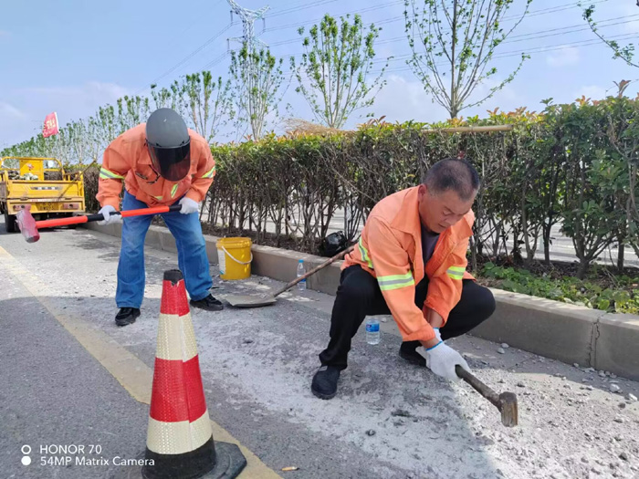 228省道西側(cè),班長姚功巡查時發(fā)現(xiàn),有近50多米長混凝土攪伴物拋灑主干道路面,如不及時處理,嚴重影響路面行車安全。班長姚功及時召集隊員,馬不停蹄趕赴道路現(xiàn)場。上午10時左右,室外氣溫已經(jīng)直逼35℃,大家顧不上天氣的炎熱,揮動手中鐵錘,不停地震動路面“凍結”已久的水泥,黨員胡可貴與同事徐育軍、伏彩林主動參戰(zhàn),交替使用手中的撬棍,盡管汗水浸透橙色衣衫,雙手磨出了血泡,大家也沒有叫苦叫累,經(jīng)過近三個多小的努力奮戰(zhàn),終于恢復原有黑色柏油路面。